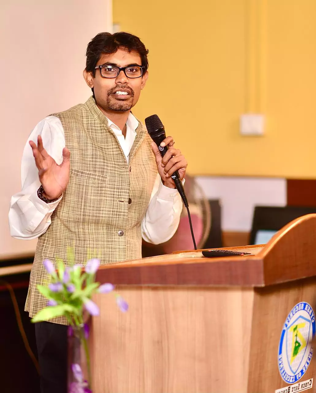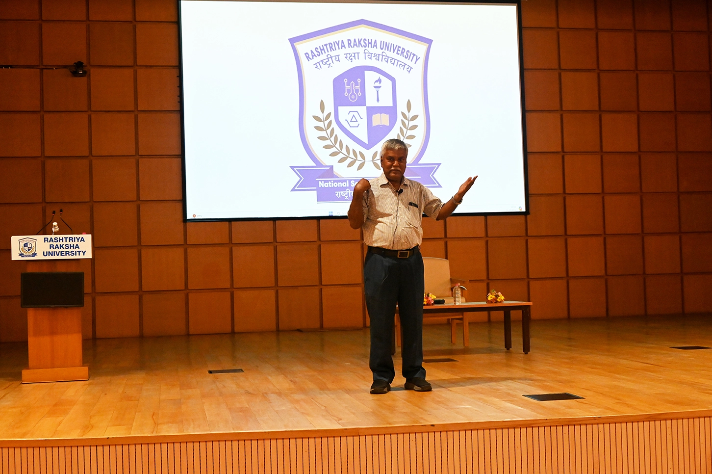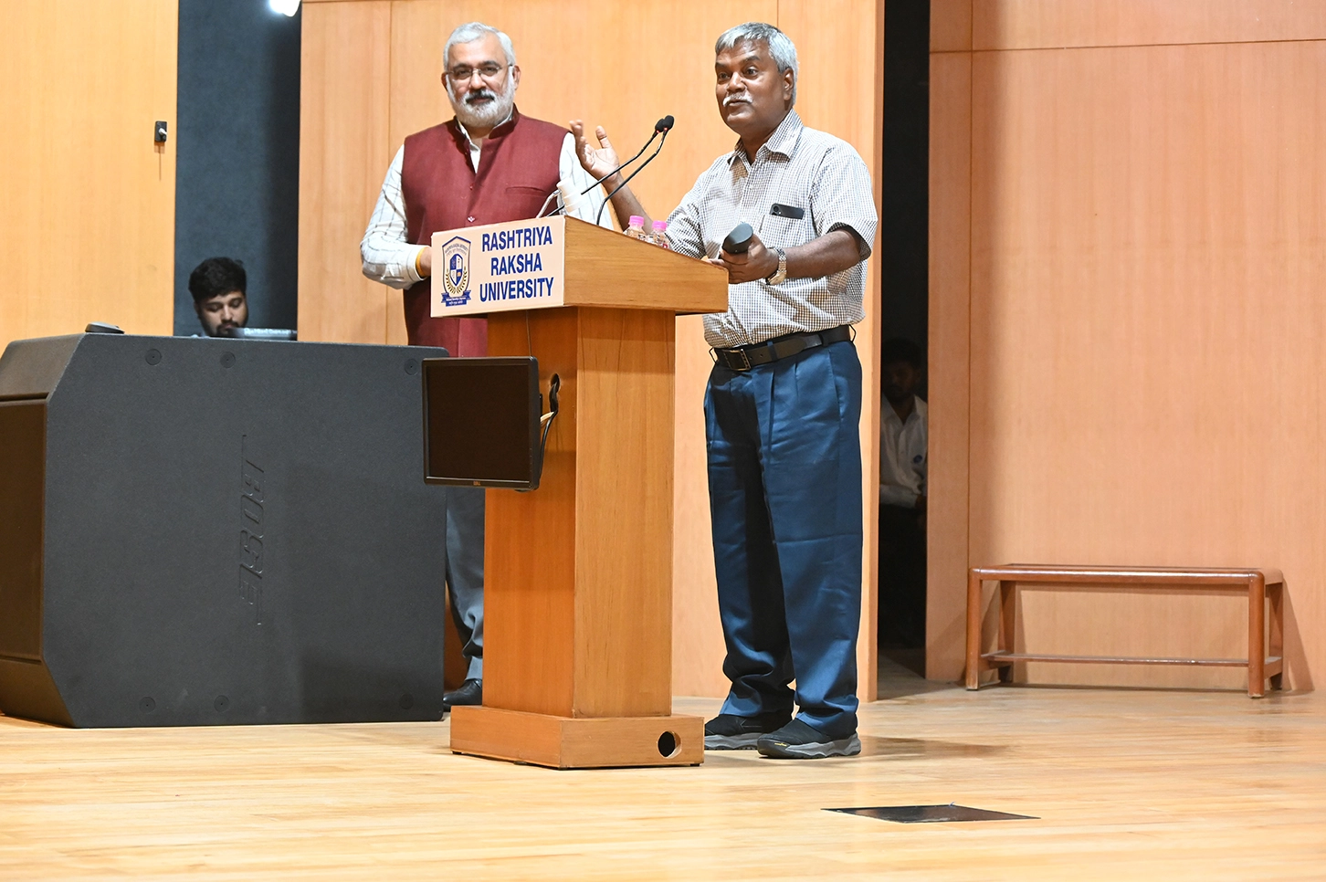 Padmasree Professor Bimal Kumar Roy addressing students at Rashtriya Rakhsha University.
